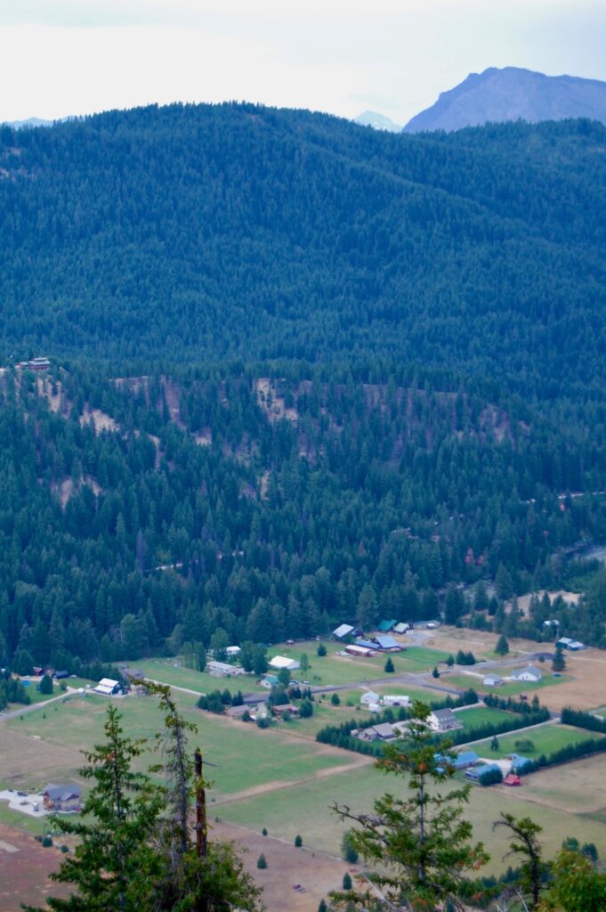 Part of the Village of Plain, WA sprawls below. The Wenatchee River runs thru the forest along the edge of town beneath Natapoc Ridge. The boundaries of private properties and the Wenatchee National Forest weave in and out of local mountains, valleys, and ranches. The River House is on the other side of the river and further downstream beyond the edge of the picture.