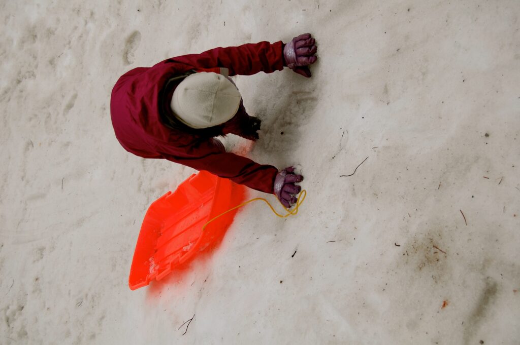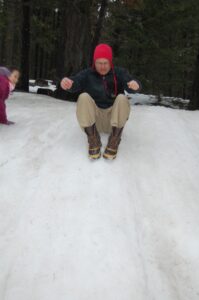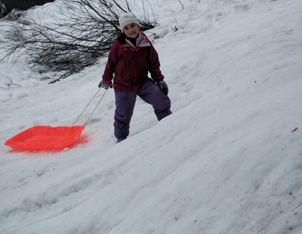 Talia’s definitely back up on top of her horse, so to speak. Here’s she is heading up the steep sliding hill out of the parking lot to get up to Sled Hill.