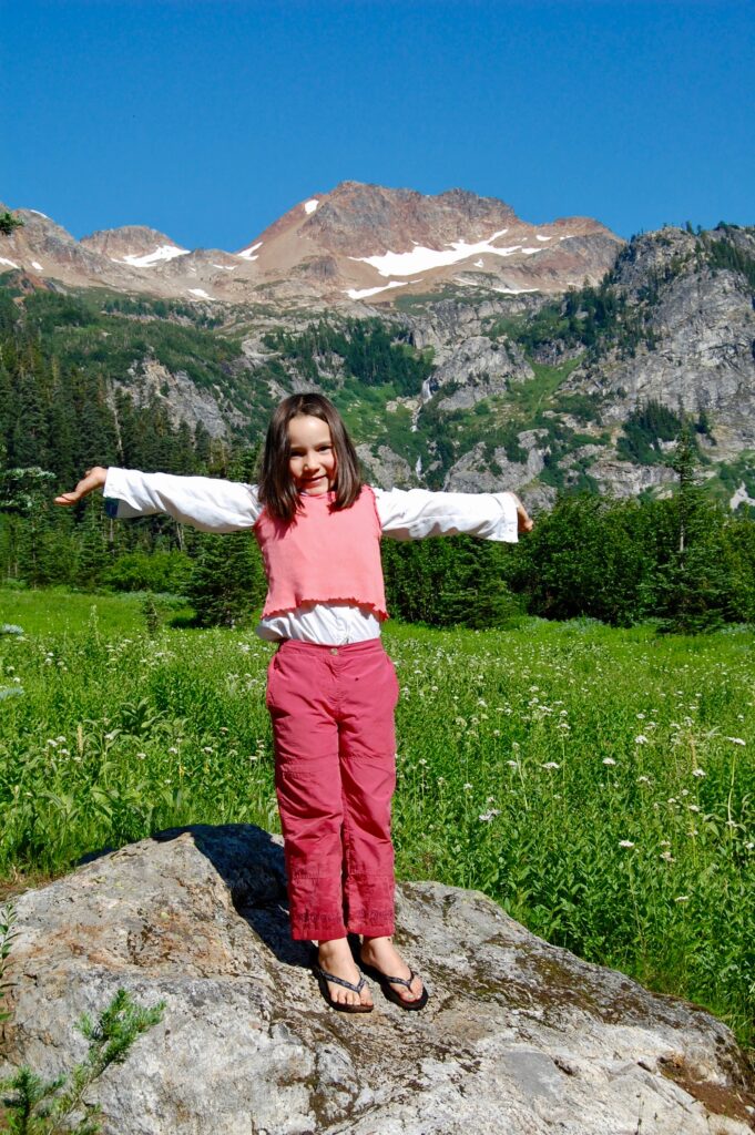 We do make it up to Spider Meadows for a few days, tho. Here Talia opens up the sky atop a boulder alongside Phelps Creek out in the main meadow. Foto by “DaDa” on Monday 27 July 2009.