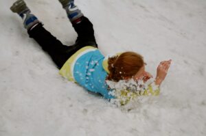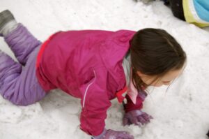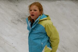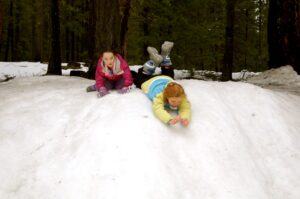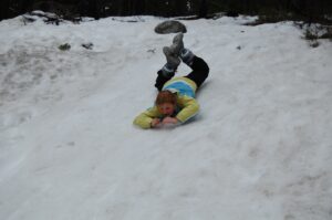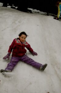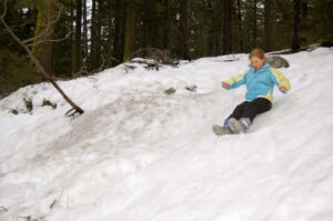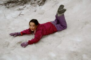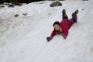 Hey, let’s have a little fun on the way back to the minivan! William wants the girls to glissade on down. Talia drops on down…