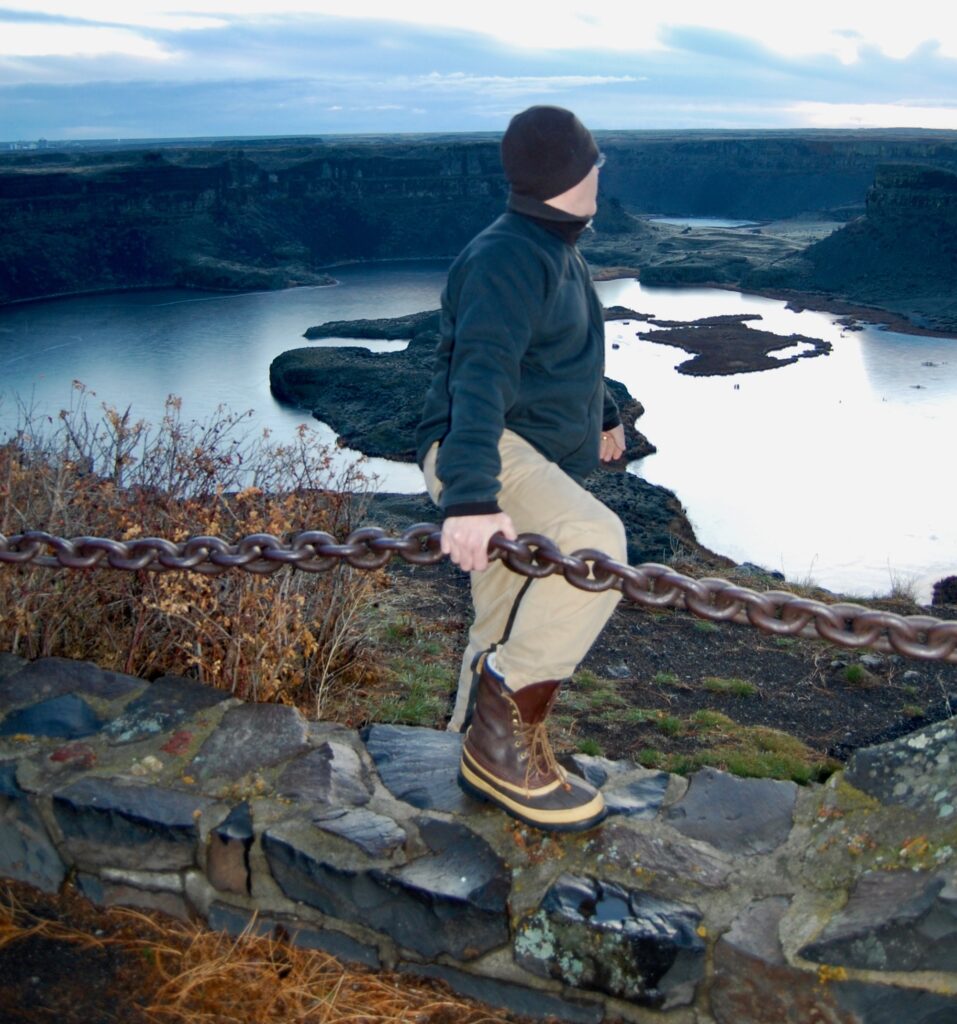 Early the next morning on our January 2010 road trip, Morgan snaps a foto of her Dad looking out across the Sun Lakes of Dry Falls in east-central Washington. These falls were formed during the Great Ice Age Bretz Floods when they swept across the lava floodplains of the Columbia River Basalt Plains in Prehistoric Times. The basalt floods covered parts of 5 Modern American states. In Washington the results of dam-breaks on giant Ice Age lakes led to massive floods that scoured those basalt plains to result in what’s called the Channeled Scablands. The geologic history is complex, tortured, beautiful, and fascinating. Today this place is part of a dual state-national park system, Sun Lakes-Dry Falls State Park of the Ice Age Floods National Geologic Trail. Monday morning of the 18th of January 2010. The two of spent the cold, windy night camping in the back of the minivan here. The River House was the jumping off place for so many fabulous adventurers … and mishaps, too! We all had many great times in the span of a few short years. For me, I recall this moment looking out across these giant coulees as I gripped a heavy, cold chain, feeling a mix of curiosity, awe, sleepiness, cold, adventure, and hunger, I remember also feeling torn by feelings of loss. Felt the slow vanishing process of losing a dream home we had worked so hard for, one we had dreamed of hosting lots of gatherings at, and eventually passing on to our children. Future plans included elevating the heat pump/AC machinery off the ground onto a high concrete block level with the porch to avoid floodwaters, removing stumps from the yard, and building a lookout tower/turrent/office combo with a spiral staircase atop the house as a second floor. Maybe even add a garage. Well, that’s all behind me now, behind all of us in the Bass-Katayama-Hughes clan as we all looked forward then and continue to look forward even now. The End. A new Beginning begins, indeed, new Beginnings every moment.