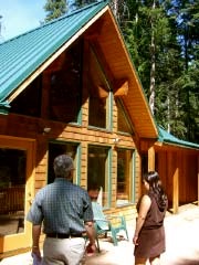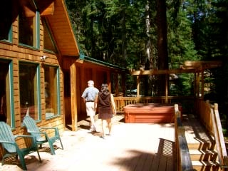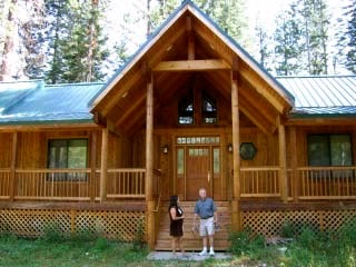 The back side, or the river front side. Hot tub in the background. Kristina with our realtor. Love those trees!