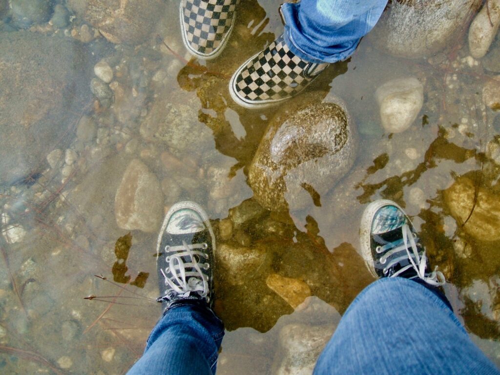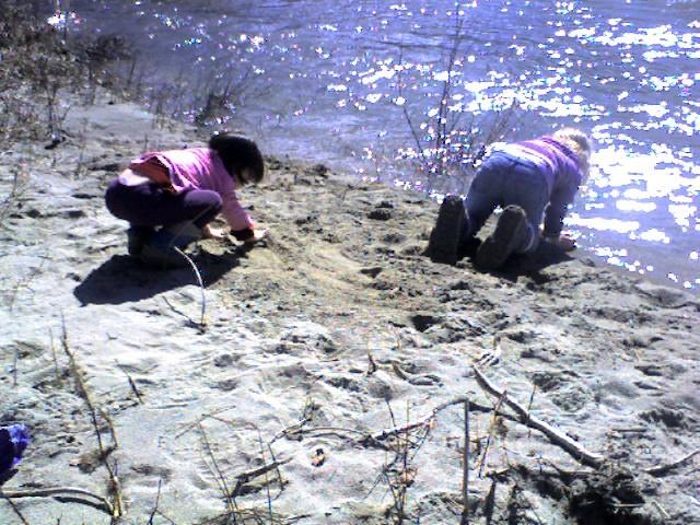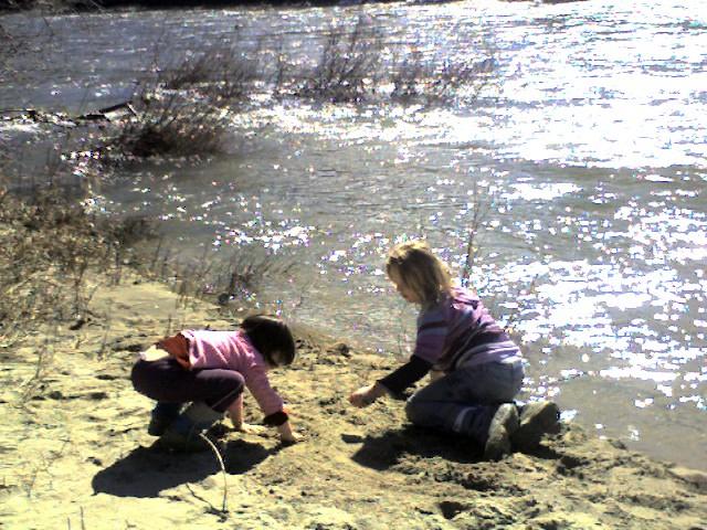 Two little humans playing at river’s edge. Talia on picture left and Katie on the right. Late Spring 2007. Grubby old cell fone pics.