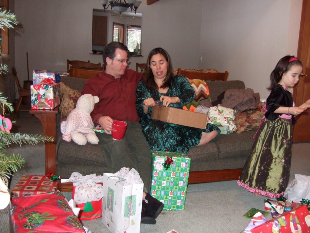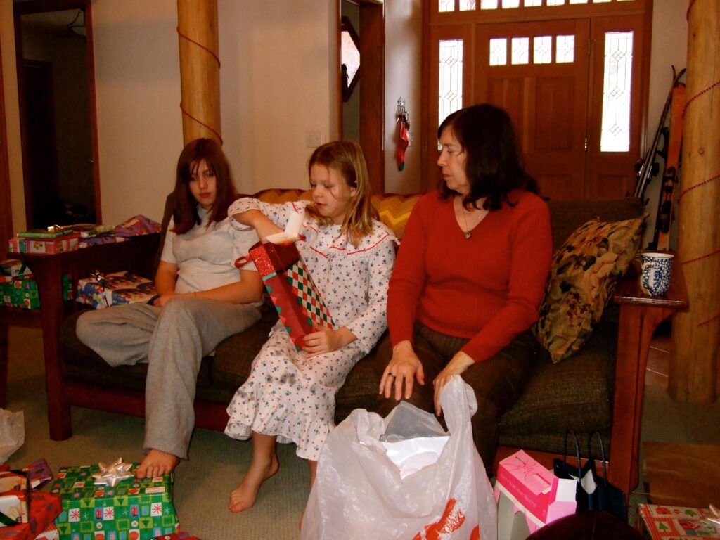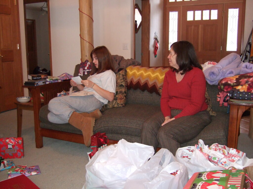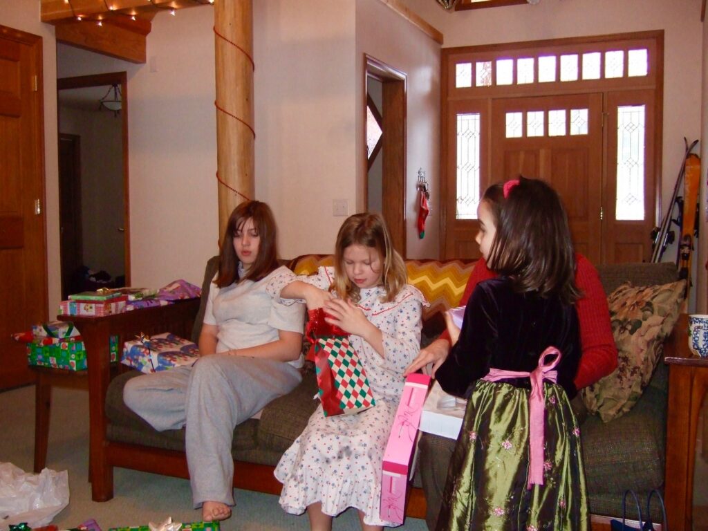 Kate opening gifts, Saturday 1 December 2007, the day after her actual birthday. L2R: Kate, Talia, Morgan, Kate’s friend Brittany. In the alcove is another wooden statue sculpted by my Aunt Helen of Richmond, VA. We called it the Wooden Goddess. Pic by Gwen Hughes. We’re back in Seattle here. During this period we drove back and forth between the River House and Yellow Dragonfly House all the time. Was common for an event to start in one house and end up in the other. Both were treasured homes.
