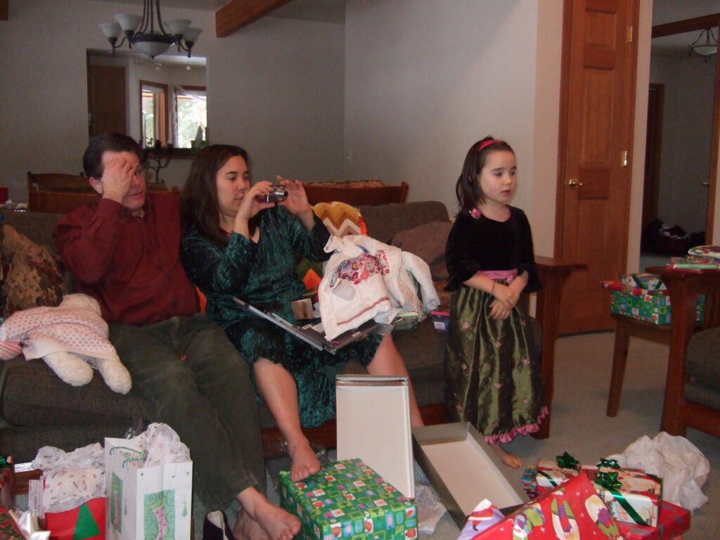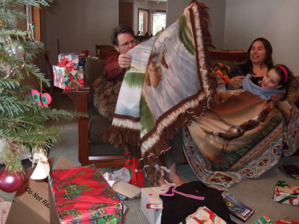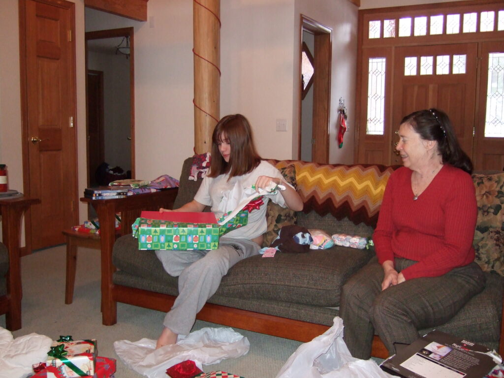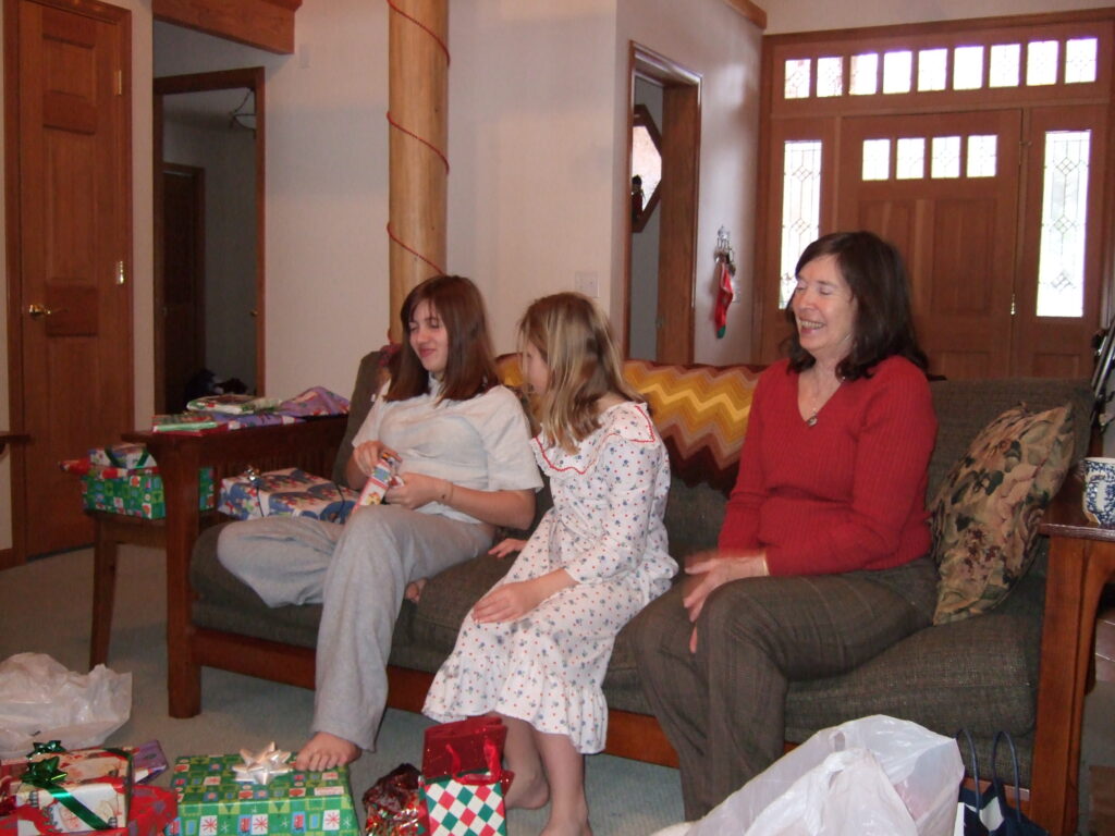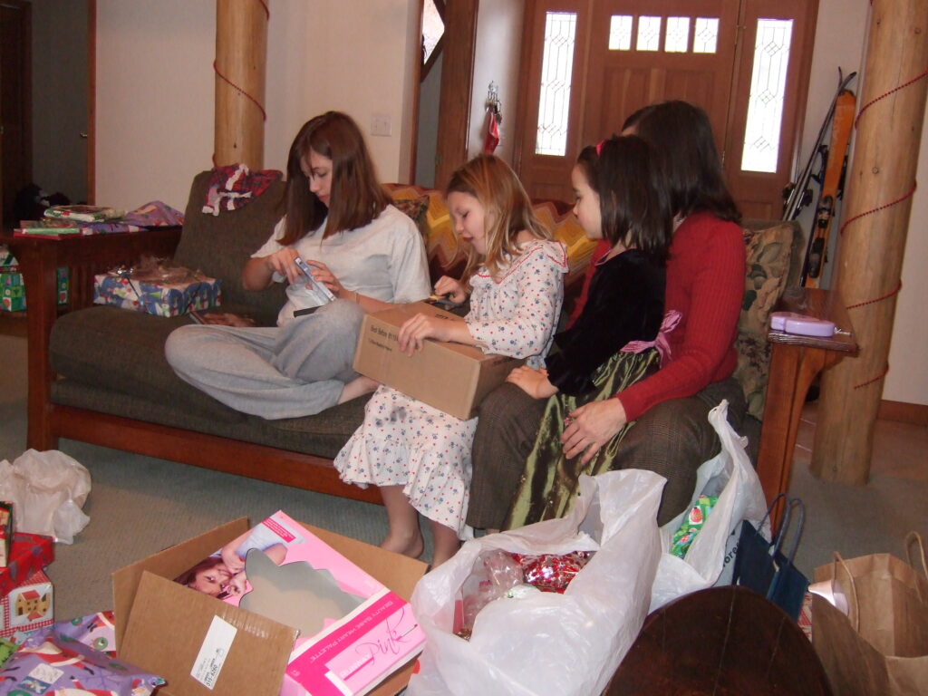 Kate opening gifts, Saturday 1 December 2007, the day after her actual birthday. L2R: Kate, Talia, Morgan, Kate’s friend Brittany. In the alcove is another wooden statue sculpted by my Aunt Helen of Richmond, VA. We called it the Wooden Goddess. Pic by Gwen Hughes. We’re back in Seattle here. During this period we drove back and forth between the River House and Yellow Dragonfly House all the time. Was common for an event to start in one house and end up in the other. Both were treasured homes.