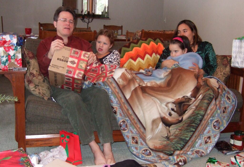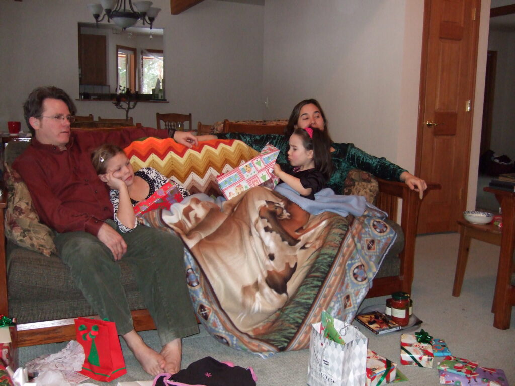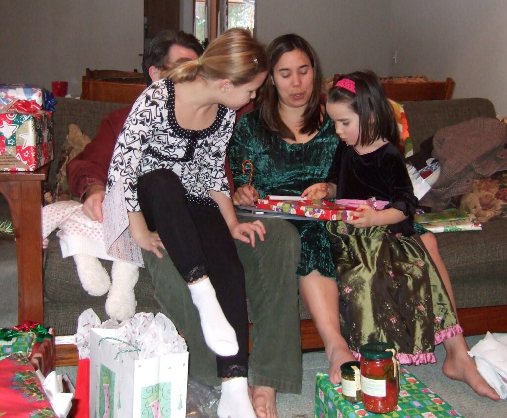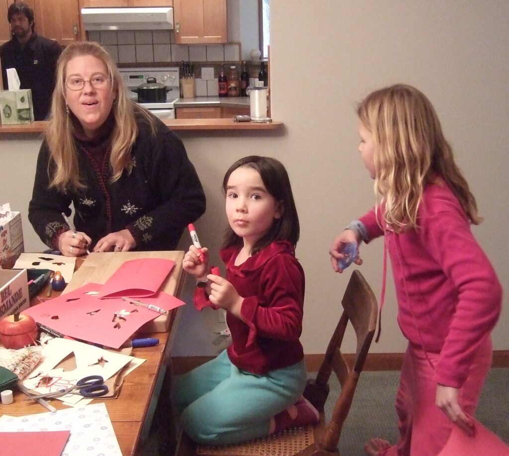 Getting ready for Thanksgiving, Solstice/Xmas, and Kate’s 9th Birthday. L2R: David (Syd’s then-husband), Syd (Kate’s Godmother), Talia, & Kate. Foto by Gwen Hughes, Kate’s Mom. Saturday 24 November 2007.