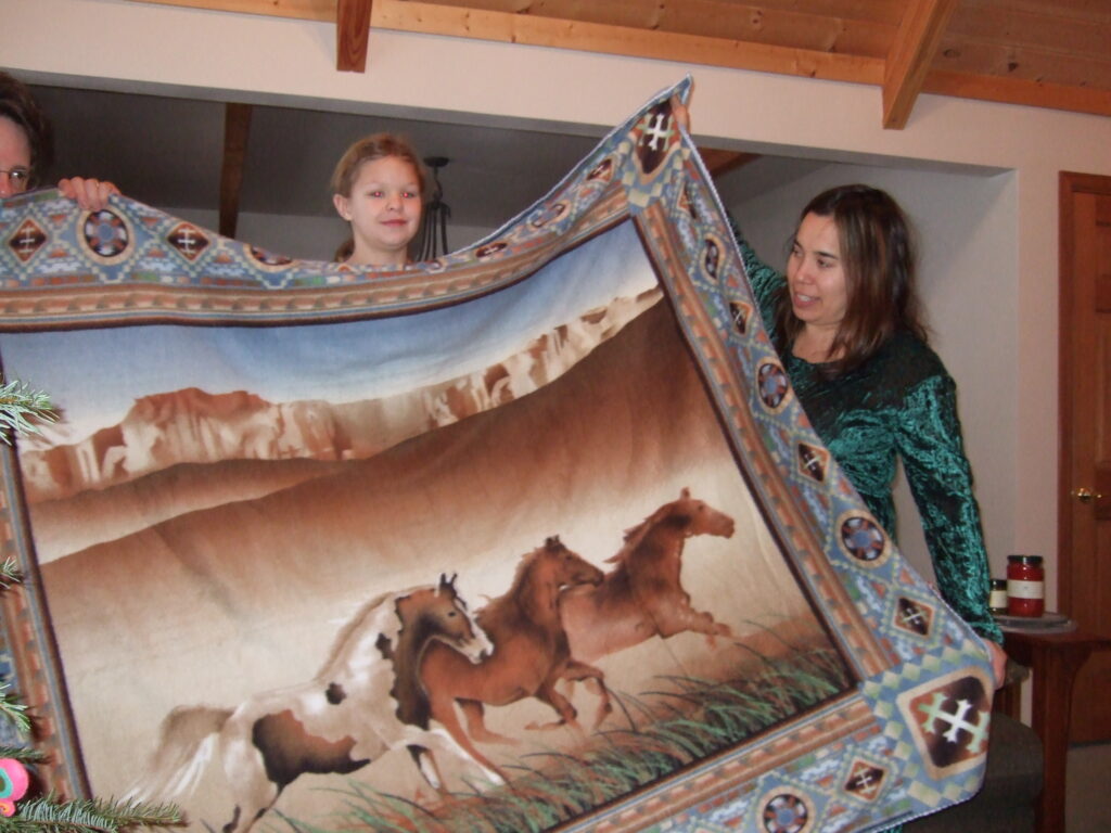 WOW! Lookit! Galloping Wild West horses! On a toasty warm blanket! That’s Kate’s head in the back, tho.