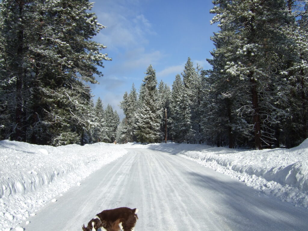 Blue skies & whispy clouds the day after. Jo’s in the road as we look down the lower Mule Tail Flats road straitaway. We liked to ski down this road as well as snowshoe and ski crosscountry thru the woods.