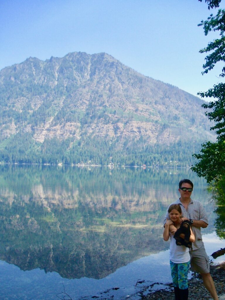 Kate & Dad on the north edge of Lake Wenatchee across from Dirtyface Peak(6,243 ft or 1,903 m high). By Kristina.