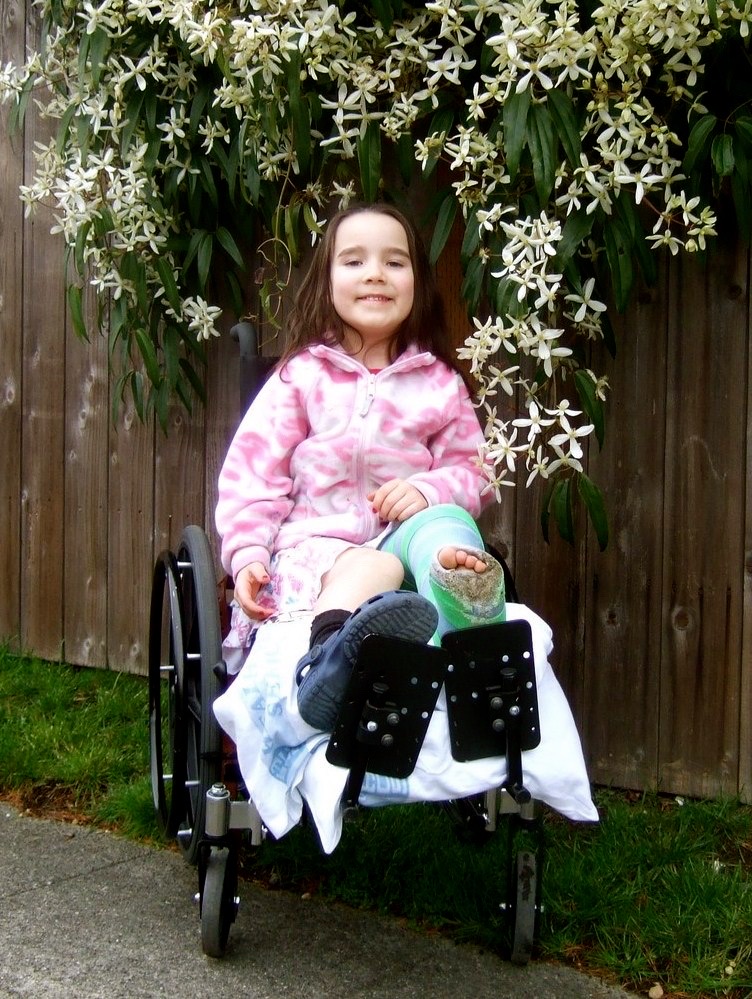 Talia’s school was extremely supportive in helping us out. Even had a special schoolbus swing by for her and her wheelchair. It was a challenge to place her upon a toilet, for example, and, y’know, we made it work. Eventually her leg healed and the cast came off in time for summer. Here she’s at the Yellow House, aka Dragonfly House, our home in the Upper Fremont/South Phinney Ridge neighborhood some called SouZoo. We were near Woodland Park Zoo and could hear the animals in the summertime. Clematis grew along the fence there.