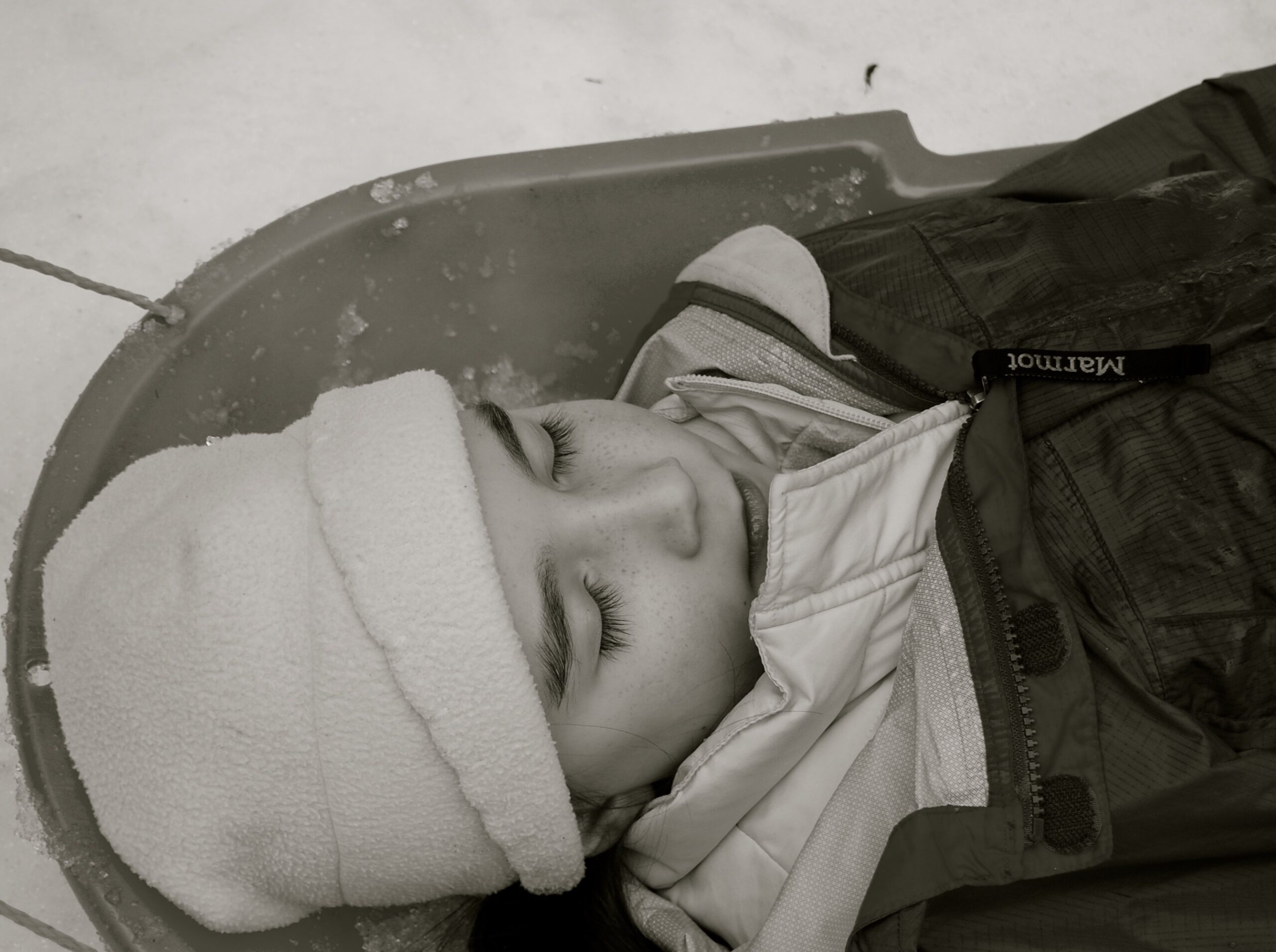 Talia pretends to sleep in the sled…