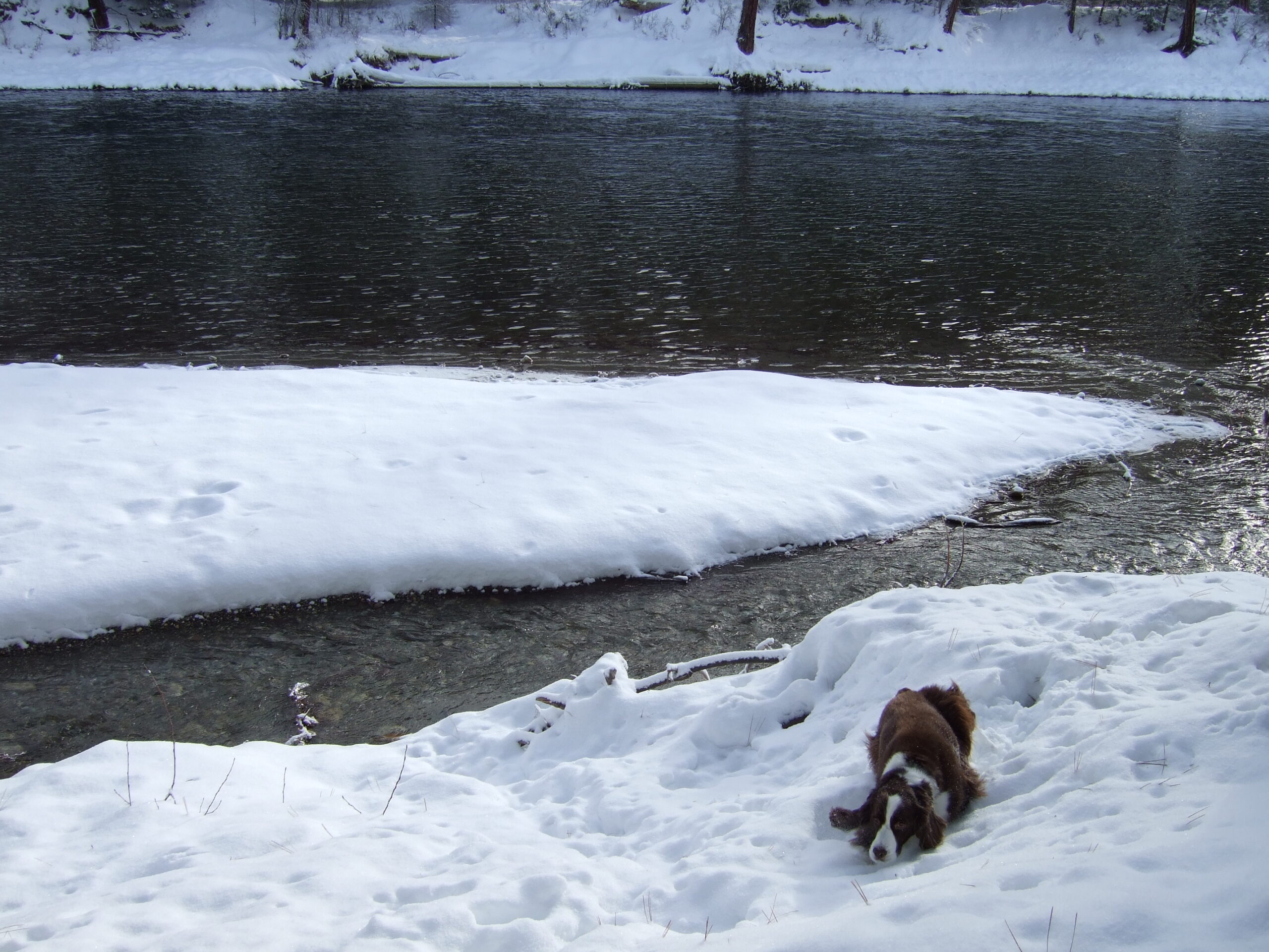 After opening presents and tearing thru colorful wrapping paper with the kids, time to go outside and take the dog, too. Jo Dog wallows in the snow. She actually likes it. Here’s the back yard at river’s edge. Christmas 2007.