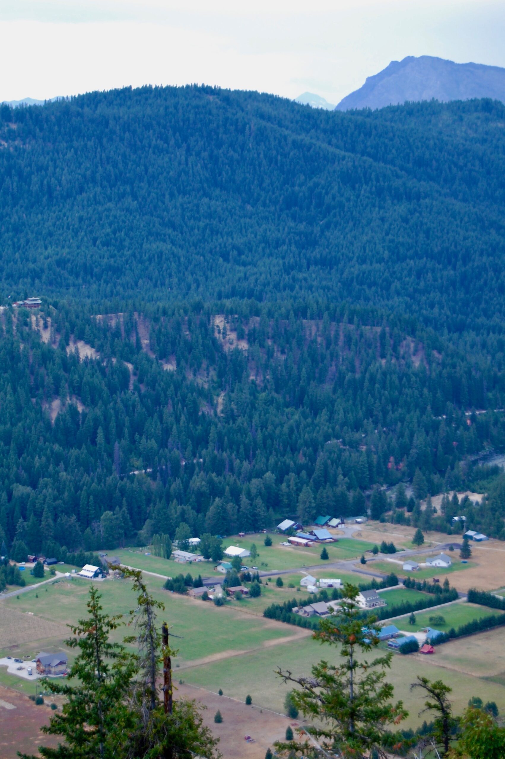 Part of the Village of Plain, WA sprawls below. The Wenatchee River runs thru the forest along the edge of town beneath Natapoc Ridge. The boundaries of private properties and the Wenatchee National Forest weave in and out of local mountains, valleys, and ranches.